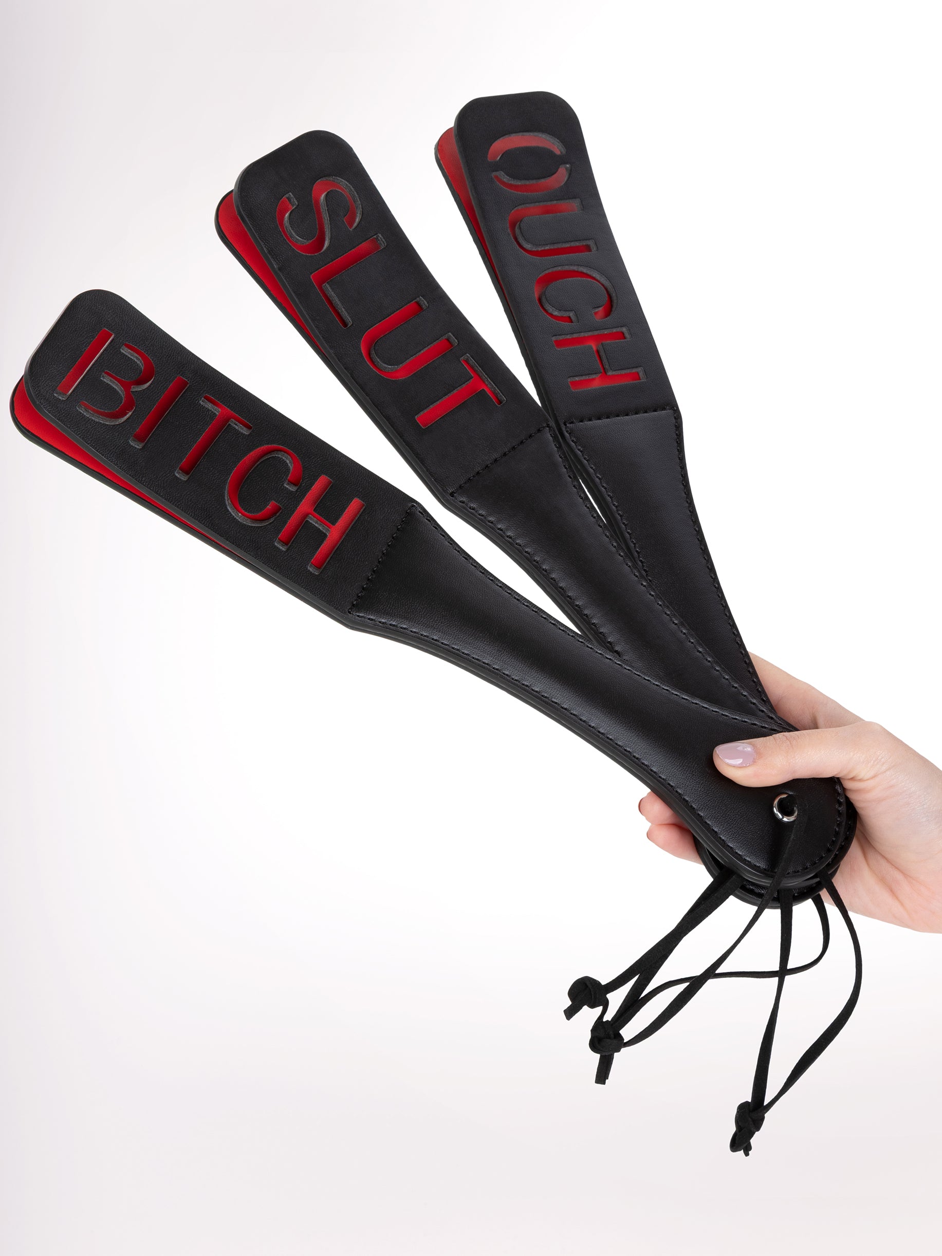 Double Echo è un paddle per sculacciare unico nel suo genere, progettato per lasciare un'impressione duratura sia fisicamente che emotivamente. Realizzato in ecopelle di alta qualità, questo paddle lungo 32 cm è composto da due strati di ecopelle, che amplificano il suono di ogni colpo, rendendo l'esperienza ancora più intensa. Disponibile in diverse varianti con scritte diverse sulla paletta, ogni colpo lascia impressa sulla pelle la scritta, aggiungendo un elemento di divertimento e provocazione ai tuoi giochi BDSM. Il Double Echo è l'accessorio perfetto per chi desidera comunicare attraverso il contatto fisico e aggiungere un tocco di creatività alle proprie sessioni.