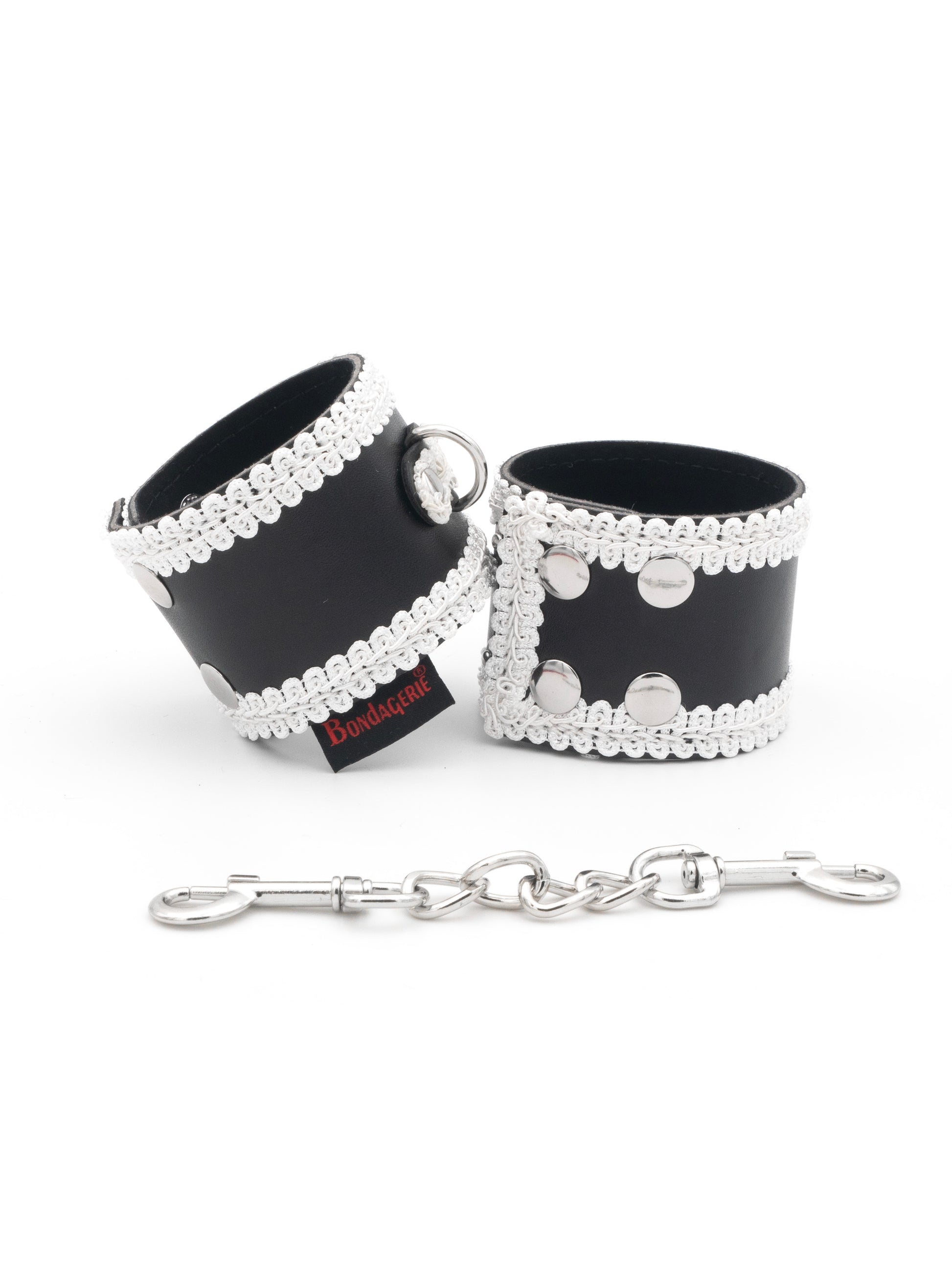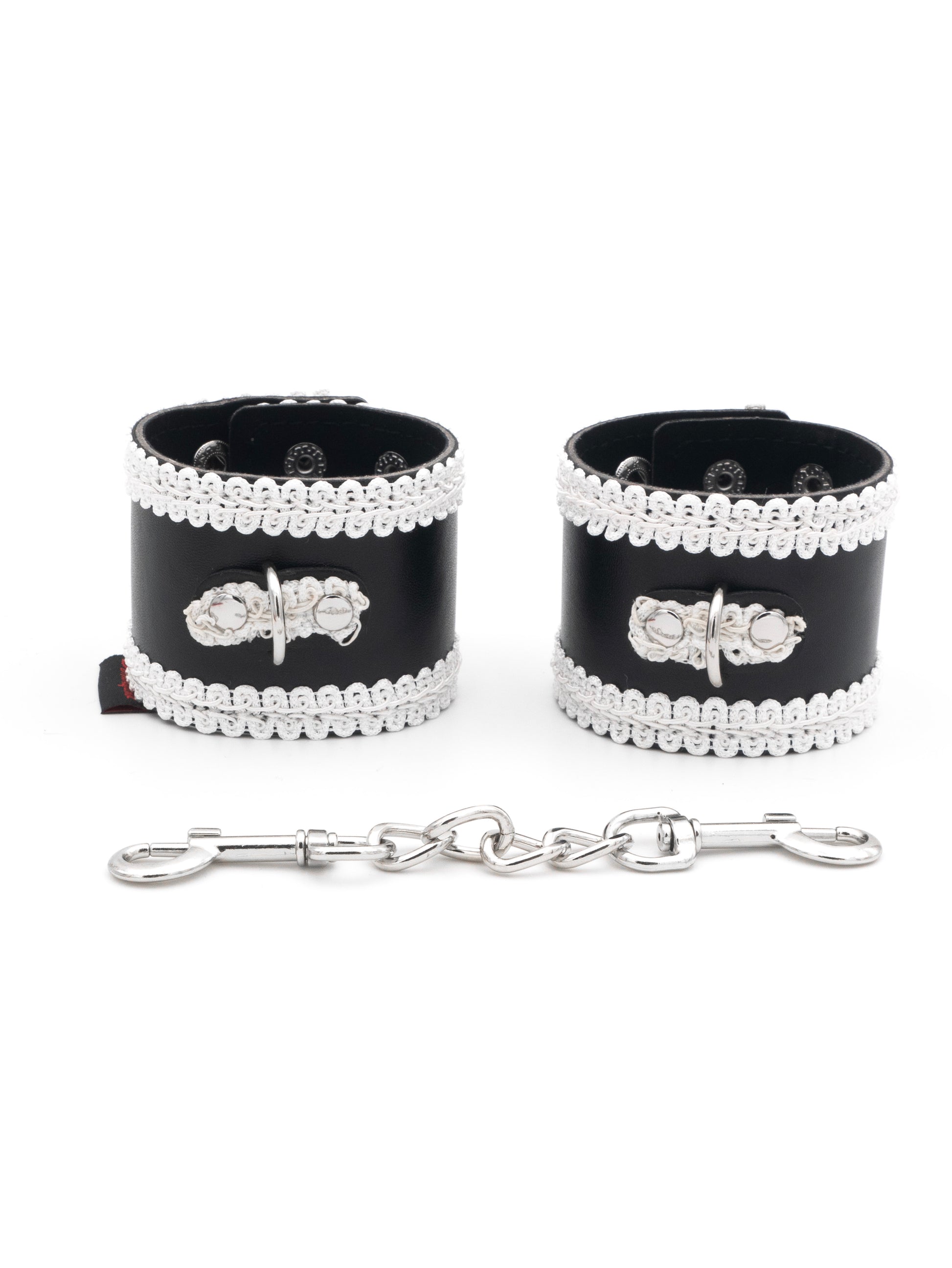 Le manette sono di misura unica e si chiudono con quattro robusti bottoni in metallo, assicurando una vestibilità sicura e regolabile. Il design elegante e i dettagli raffinati le rendono perfette per momenti di gioco sofisticati e sensuali.