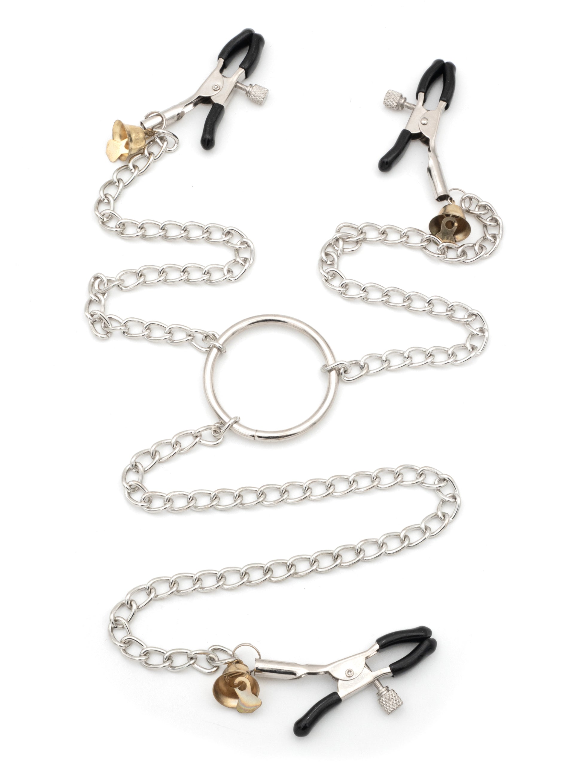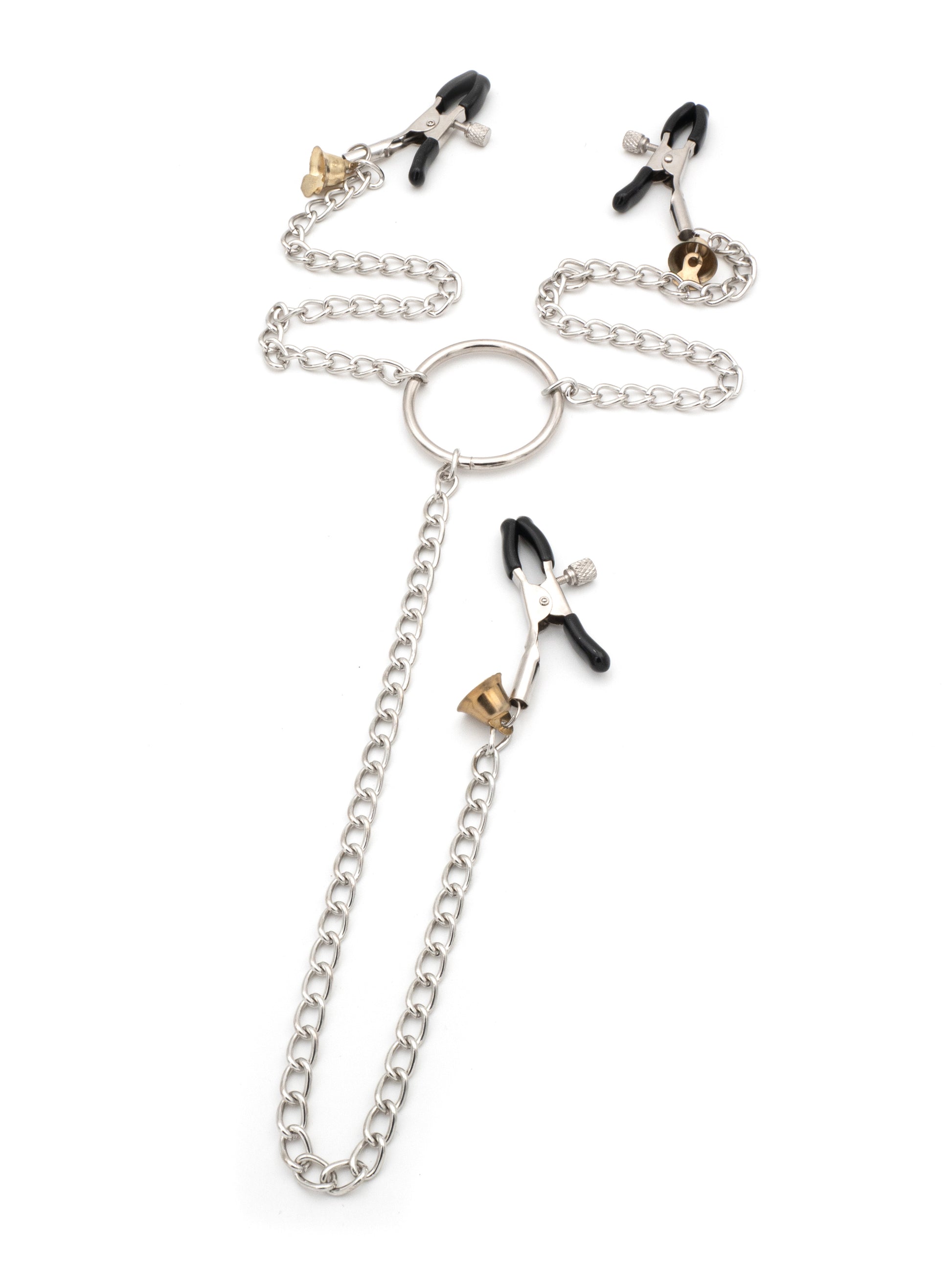 Esplora nuovi livelli di stimolazione con le Pinze per Capezzoli a Molla con Intensità Regolabile. Questo set innovativo comprende tre pinze, tutte collegate a un anello centrale. Due delle pinze sono progettate per i capezzoli, mentre la terza può essere utilizzata su altre zone erogene come la vagina o il pene. Ogni pinza è dotata di un regolatore di intensità per un controllo preciso della pressione.