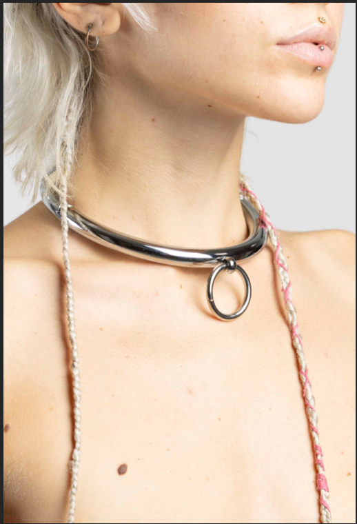 Steel Embrace rappresenta l'apice della raffinatezza nel mondo del BDSM. Questo collare in metallo, con il suo design arrotondato, è perfetto per chi cerca un'alternativa elegante e robusta ai collari tradizionali. Con un diametro di 11,2 cm e uno spessore di 1,2 cm, il collare offre una presenza imponente. La chiusura a vite, sicura e discreta, è progettata per garantire che solo chi detiene la chiave possa decidere quando liberare il portatore, quindi si presta alla perfezione per sessioni bdsm molto intense e profonde. L'anellino frontale, pratico e funzionale, è ideale per collegare guinzagli o altri accessori, amplificando le possibilità di gioco e sottomissione.